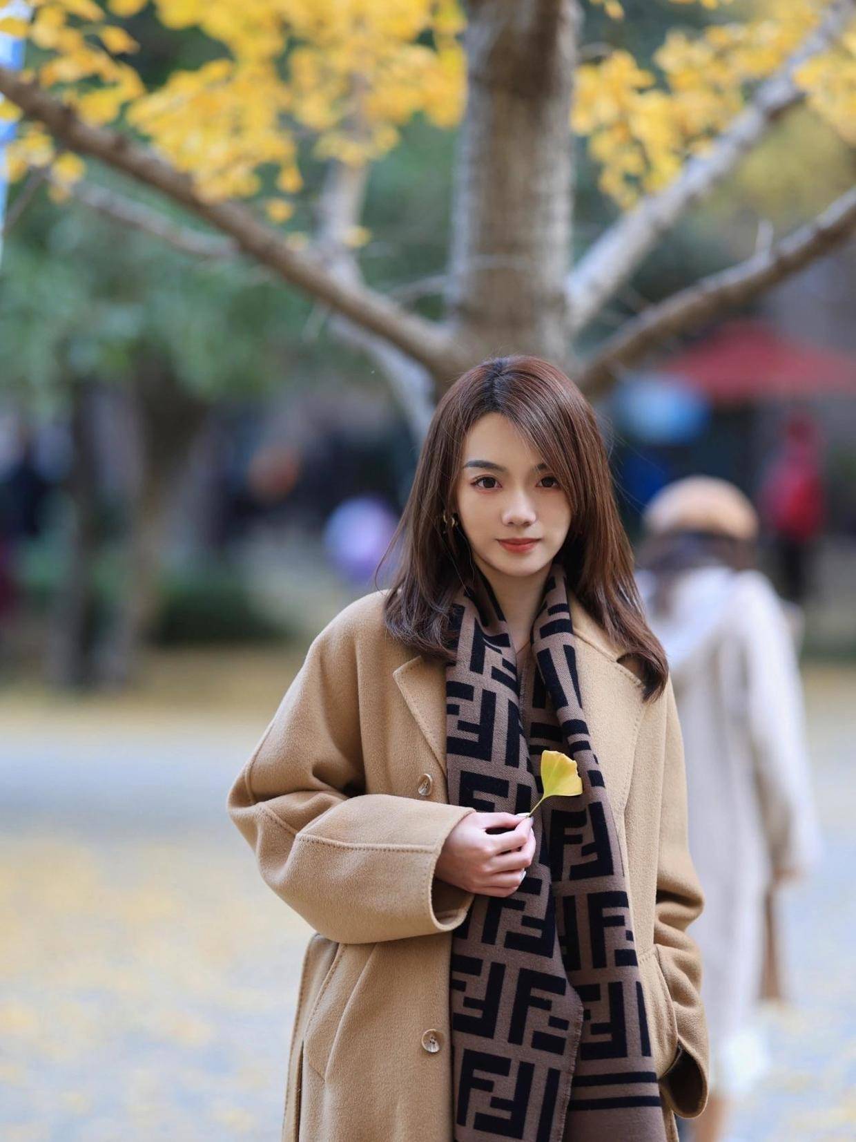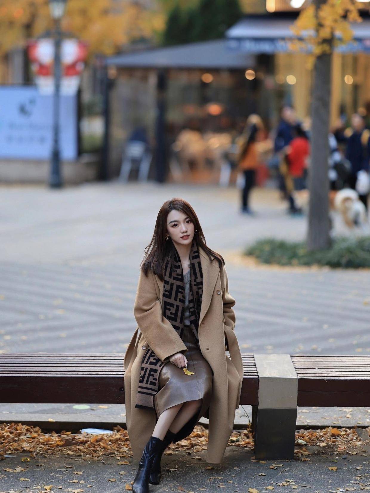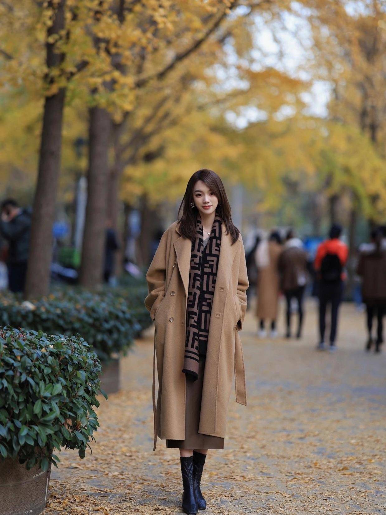 怕冷的小姐姐可以再为自己搭配上一条围巾,选择深棕色来作为配色,这样可以和浅棕色的大衣起到一定的呼应效果。