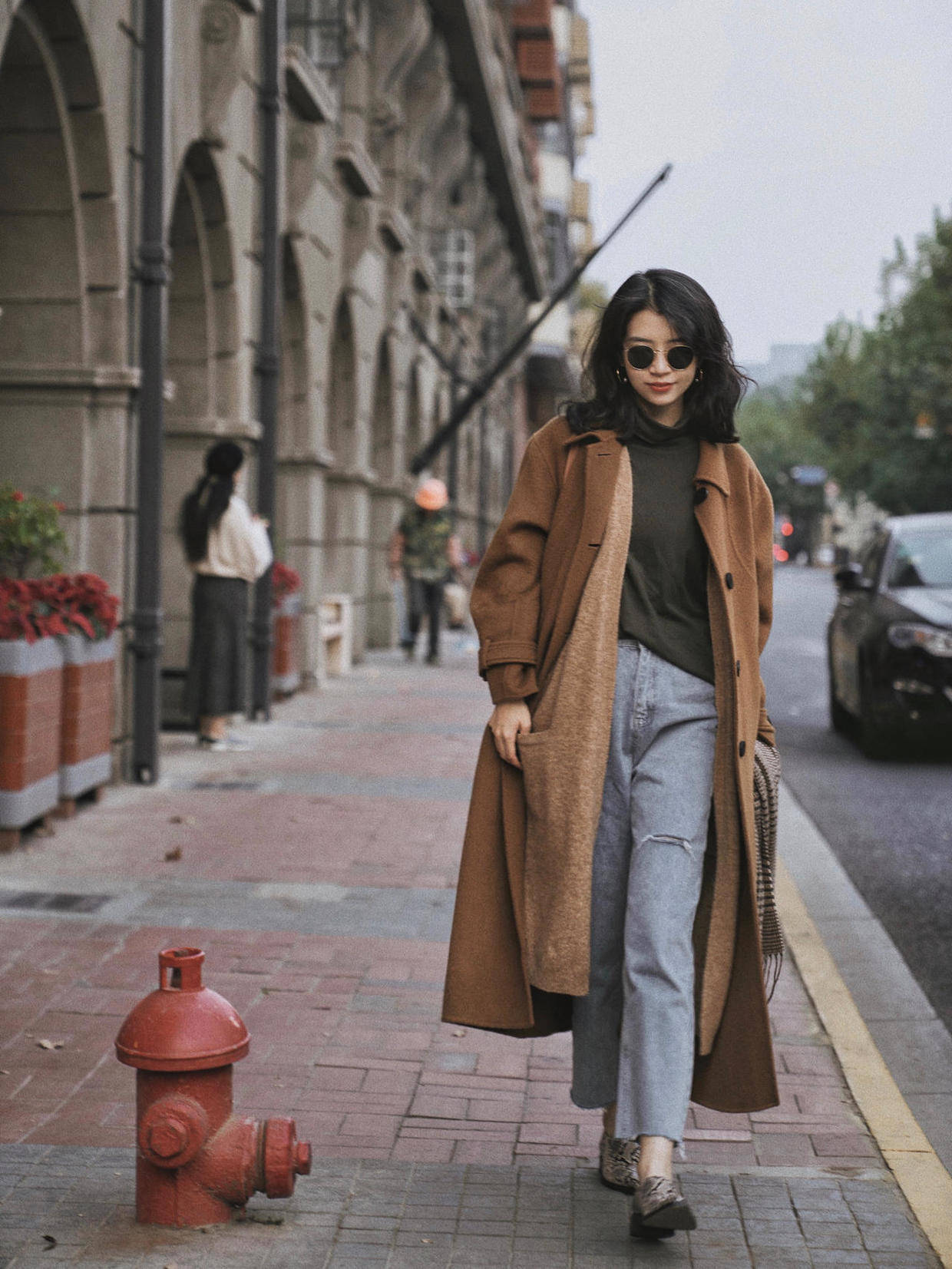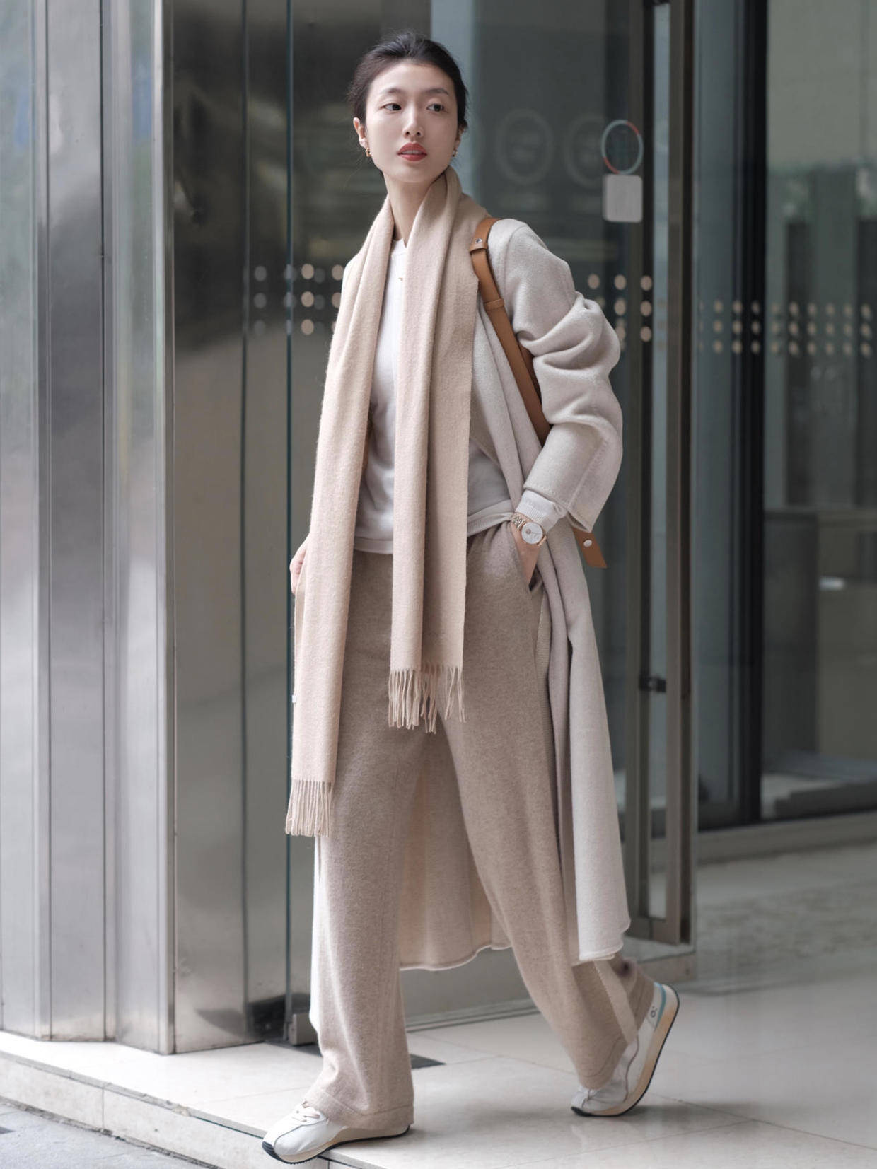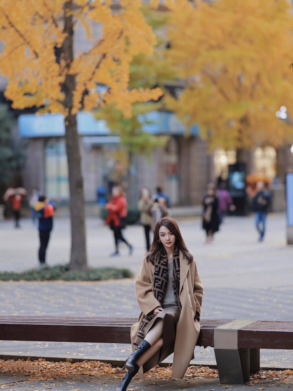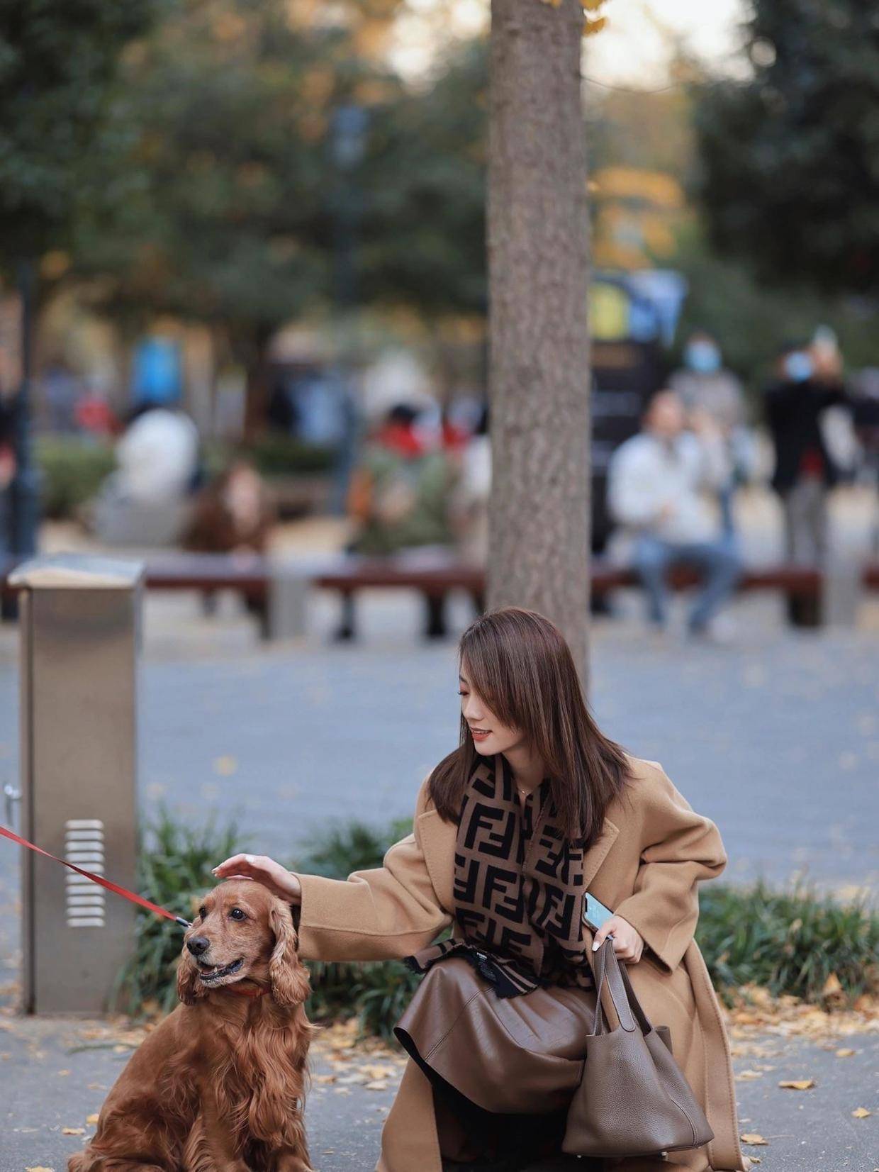 怕冷的小姐姐可以再为自己搭配上一条围巾,选择深棕色来作为配色,这样可以和浅棕色的大衣起到一定的呼应效果。